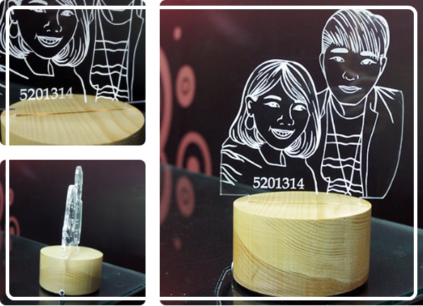 將人物紀念的照片,做描線稿後雕刻在精美的造型壓克力上